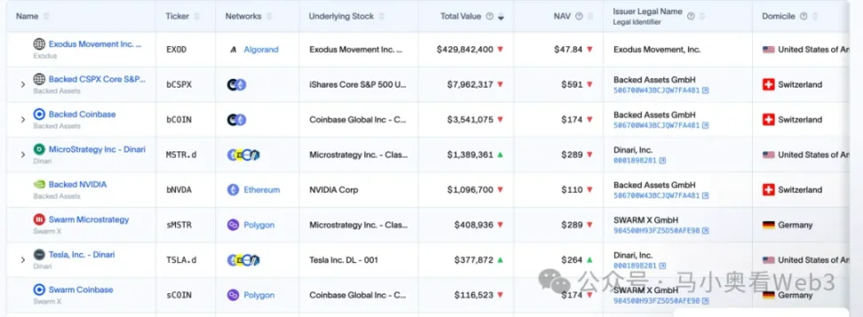 Теперь давайте рассмотрим текущее состояние рынка акций RWA. В целом рынок все еще находится на ранней стадии развития, и на нем по-прежнему доминируют акции США. По данным RWA.xyz, общая эмиссия текущего рынка акций RWA достигла 445,40 млн долларов США, но стоит отметить, что 429,84 млн долларов США из этой эмиссии относятся к одной цели — EXOD, которая представляет собой ончейн-акции, выпущенные Exodus Movement, Inc. — компанией-разработчиком программного обеспечения, специализирующейся на разработке самостоятельных криптовалютных кошельков. Компания была основана в 2015 году и имеет штаб-квартиру в Небраске, США. Акции компании котируются на Нью-Йоркской фондовой бирже (NYSE America), и пользователи имеют право переносить свои обыкновенные акции класса A в блокчейн Algorand для управления. Пользователи могут напрямую просматривать стоимость этих ончейн-активов в кошельке Exodus Wallet. Текущая общая рыночная стоимость компании составляет 1,5 млрд долларов.
