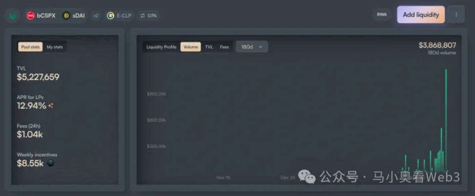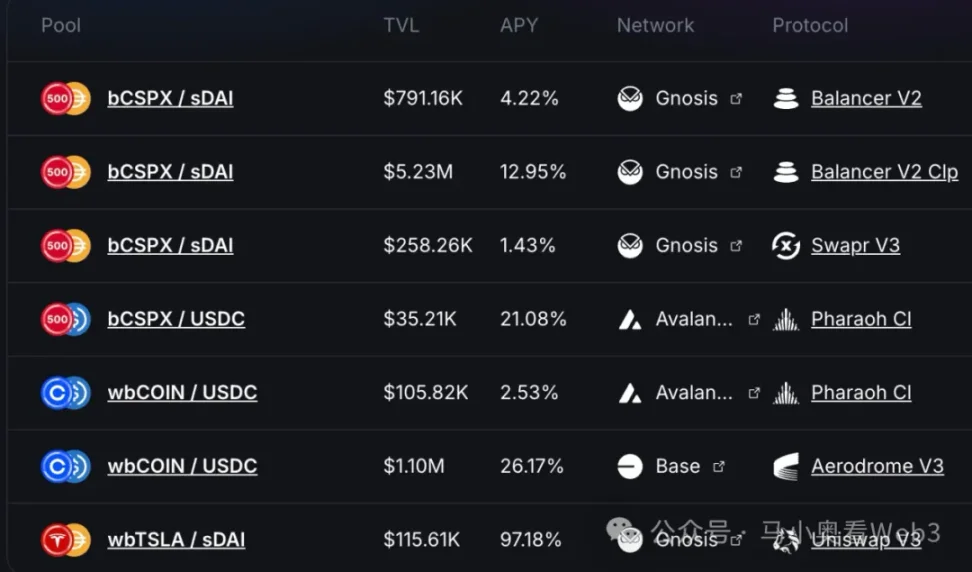 С точки зрения объема эмиссии принятие Backed в основном сосредоточено на двух активах: CSPX и COIN, из которых первый имеет объем эмиссии около 10 млн долларов США, а второй — около 3 млн долларов США. Что касается ликвидности внутри сети, она в основном сосредоточена в цепочках Gnosis и Base, из которых ликвидность bCSPX составляет около 6 млн долларов США, а ликвидность wbCOIN — около 1 млн долларов США. С точки зрения объема торгов он не очень высок. Если взять в качестве примера крупнейший пул ликвидности bCSPX, то с момента его развертывания 21 февраля 2025 года совокупный объем торгов составляет около 3,8 млн долларов США, а совокупное количество транзакций — около 400 раз.