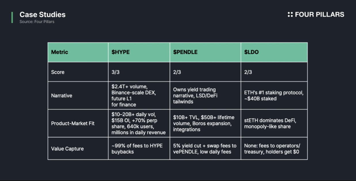Редкие проекты, такие как HYPE, идеально соответствуют всем трём критериям. Многие изначально сильные протоколы всё ещё испытывают трудности с захватом стоимости, что ограничивает потенциал роста токенов, даже если их фундаментальные показатели прочны; в некоторых случаях всё наоборот.