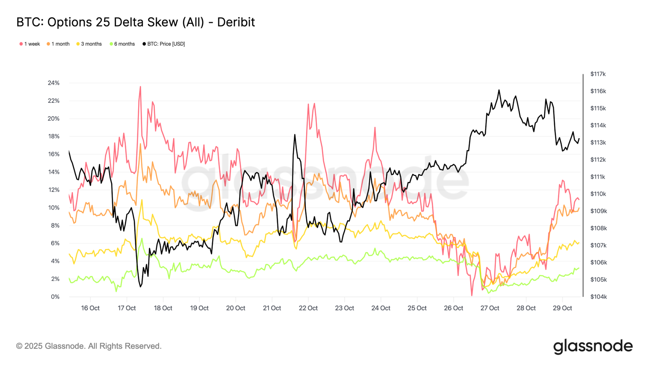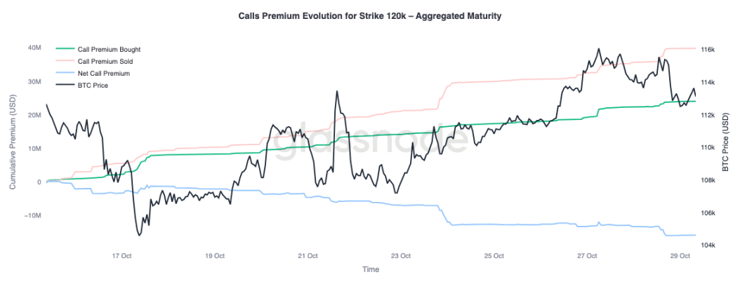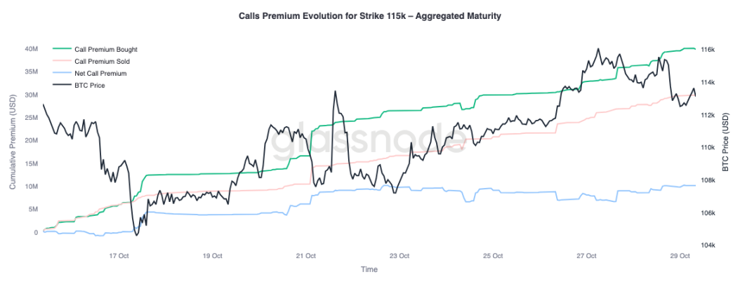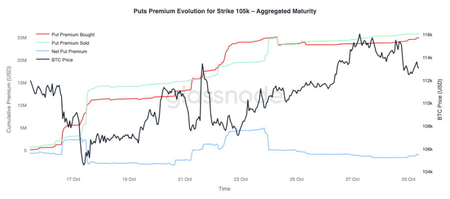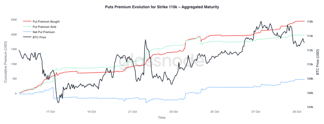 Чтобы получить более полную картину, обратимся к рыночным пут-опционам. С 24 октября, на фоне резкого роста биткоина, трейдеры покупали пут-опционы на сумму 110 000 долларов, что указывает на необходимость защиты от краткосрочного снижения. В то же время, пут-опционы на сумму 105 000 долларов продавались более агрессивно, что говорит о том, что участники охотно получают премии, предоставляя страховку по более высокой цене исполнения.