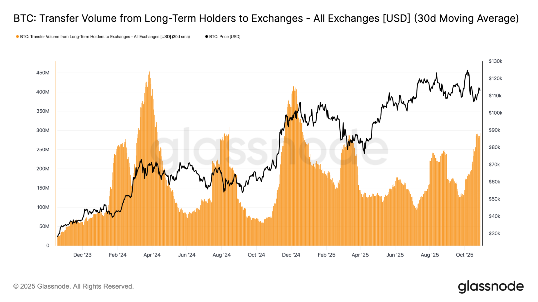 Чтобы оценить интенсивность продаж долгосрочными держателями, можно обратиться к объёму токенов, переведённых ими на биржи (30-дневная простая скользящая средняя), метрике, отражающей стоимость токенов, переведённых опытными инвесторами в ожидании потенциальной продажи. Этот показатель вырос примерно до 293 миллионов долларов в день, что более чем вдвое превышает бенчмарк в 100-125 миллионов долларов, который наблюдается с ноября 2024 года.