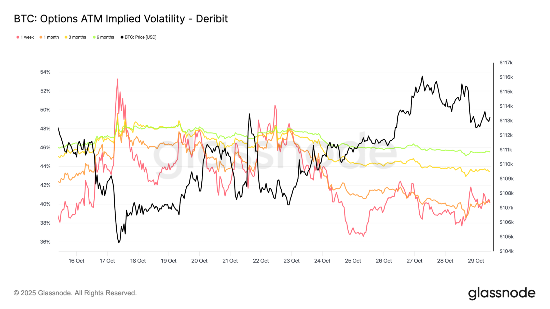 Что касается рынка опционов, последние данные показывают, что давление волатильности после обвала 10 октября продолжает ослабевать. 30-дневная реализованная волатильность биткоина упала до 42,6%, что немного ниже 44% на прошлой неделе, что отражает более спокойную динамику цены. Между тем, подразумеваемая волатильность, отражающая ожидания трейдеров, снизилась ещё сильнее, поскольку участники отказываются от хеджирования снижения и уменьшают потребность в защите.