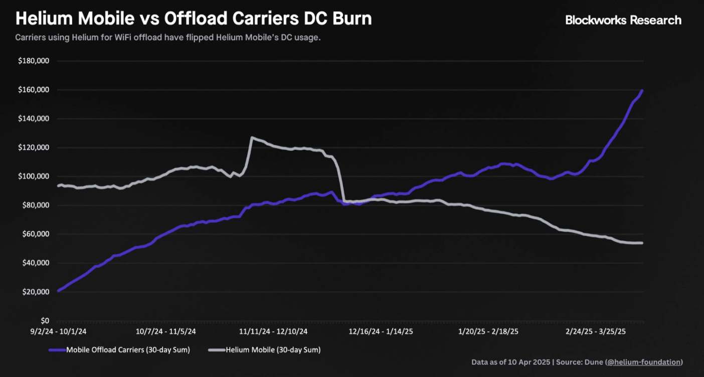 «Что еще более важно, поток доходов Helium постепенно смещается от Helium Mobile к Mobile Offload, на который теперь приходится примерно в три раза больше потребляемого кредита данных и который растет почти на 180% ежемесячно, что является невероятным темпом роста для протокола DePIN (децентрализованный Интернет вещей), продаваемого в корпоративном бюджетном сегменте».