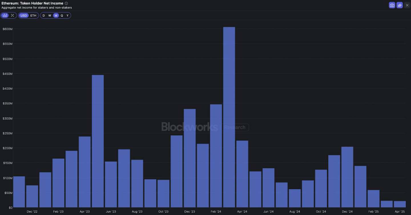 По данным Blockworks Research, в апреле Solana зафиксировала «чистый доход держателей токенов» в размере 36 миллионов долларов, что дает токену SOL годовой доход, превышающий 178x — этот показатель, хотя и высок, может быть оправдан, учитывая текущий низкий уровень активности.
