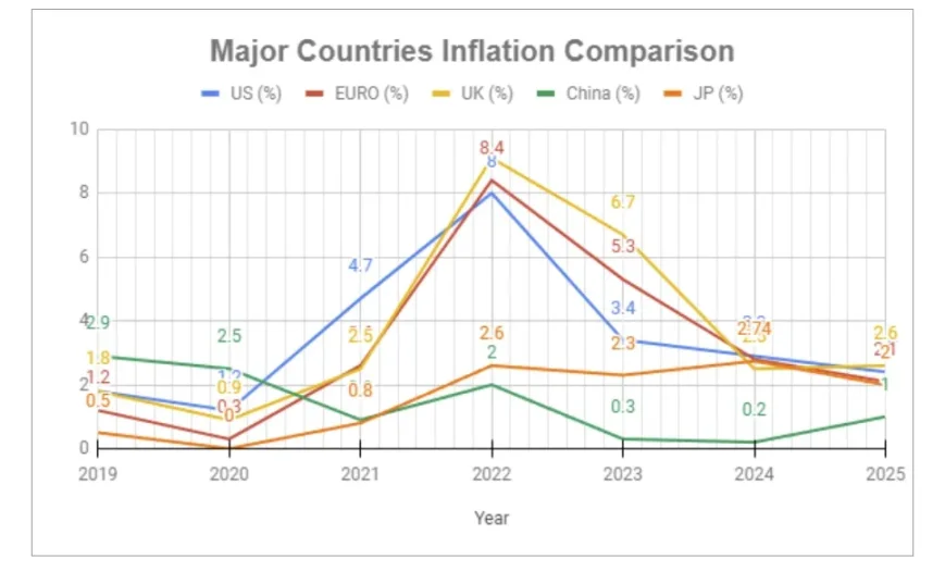 Уровень инфляции в Китае в 2019 году составил около 2,9%, а в США — 2,3%. В то время из-за субсидий на борьбу с пандемией COVID-19 в 2020 году мы прогнозировали, что существенное увеличение субсидий в долларах США приведет к значительному росту уровня инфляции в период с 2020 по 2022 год. Уровень инфляции в Соединенных Штатах действительно достиг максимума в 8%, а затем снижался из года в год из-за политики повышения процентных ставок Федеральной резервной системы. К 2024 году этот показатель снизится примерно до 2,2%. Годовой уровень инфляции в Китае составляет около 0,2%, что делает его одной из основных стран с относительно хорошим контролем инфляции (2019–2024 гг.: данные получены из официальных статистических агентств разных стран. 2025 г.: данные представляют собой прогнозное значение отчета Международного валютного фонда (МВФ) и фактические обновления). Большинство развитых стран имеют статистические данные около 2,5%, но фактический опыт покупок и обесценивания валюты должен быть значительно выше статистических данных.