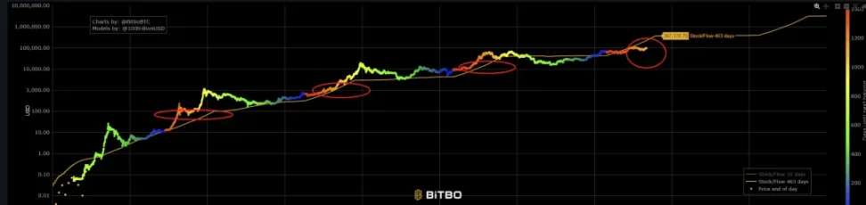 Накопление импульса для роста (6 месяцев до халвинга) → Плавные колебания (6 месяцев после халвинга) → Основной всплеск восходящей волны (6-18 месяцев после халвинга) Халвинг 2024 года завершится в течение года, а это значит, что рынок все еще может накапливать энергию для более позднего всплеска. Это было похоже на канун 2017 года, который по совпадению также был первым днем президентства Трампа. В то же время график Stock-to-Flow также косвенно помогает нам получить ориентировочную перспективу стоимости акций, которые все еще находятся в процессе накопления силы, а затем взрываются: однако исторические данные и правила имеют лишь ориентировочную ценность. Мы не можем слепо следовать указаниям данных, но также должны иметь достаточную самооценку и изучать DYOR.