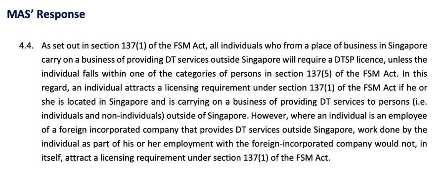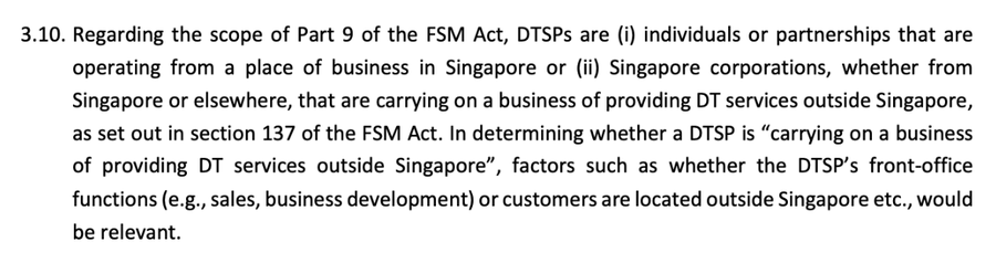 «Согласно разделу 137(1) FSMA, каждое лицо, которое осуществляет деятельность по предоставлению услуг цифровых токенов лицам за пределами Сингапура из места ведения бизнеса в Сингапуре, обязано получить лицензию DTSP, если только лицо не относится к классу лиц, указанному в разделе 137(5) FSMA. В этой связи, если лицо находится в Сингапуре и осуществляет деятельность по предоставлению услуг цифровых токенов лицам за пределами Сингапура (т. е. физическим и нефизическим лицам), лицо обязано подать заявление на получение лицензии в соответствии с разделом 137(1) FSMA.