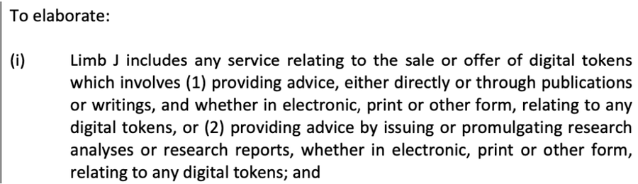 «Любая услуга, связанная с продажей или предложением цифровых токенов, включая: (1) предоставление консультаций, связанных с цифровыми токенами, как напрямую, так и посредством публикаций, статей или любой другой формы (электронной, печатной или иной).