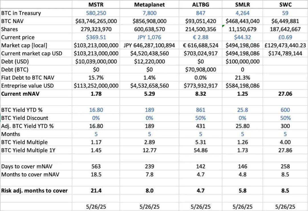 - С точки зрения риска, долг MSTR и SMLR составляет 15,7% и 21,3% от их чистой стоимости активов BTC соответственно, поэтому они сталкиваются с более высокими рисками при падении цены BTC; в то время как у ALTBG и SWC нет долга, и их риски более контролируемы.