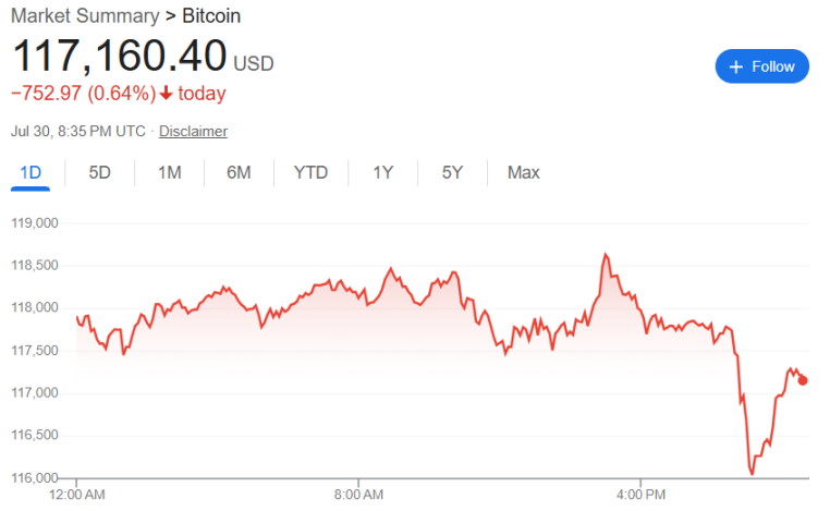Ранее в тот же день газета Wall Street Journal сообщила, что июльское решение Федеральной резервной системы по процентной ставке в конечном итоге оставило ключевую ставку без изменений, как и ожидалось. Пауэлл также не дал никаких прогнозов относительно снижения ставки в сентябре, подчеркнув неопределенность, связанную с тарифами и инфляцией, и заявив, что рынок труда не ослаб. Биткоин ненадолго упал на 2,5% с внутридневного максимума. Хотя цена биткоина отыграла рост после публикации отчета, она продолжала снижаться.