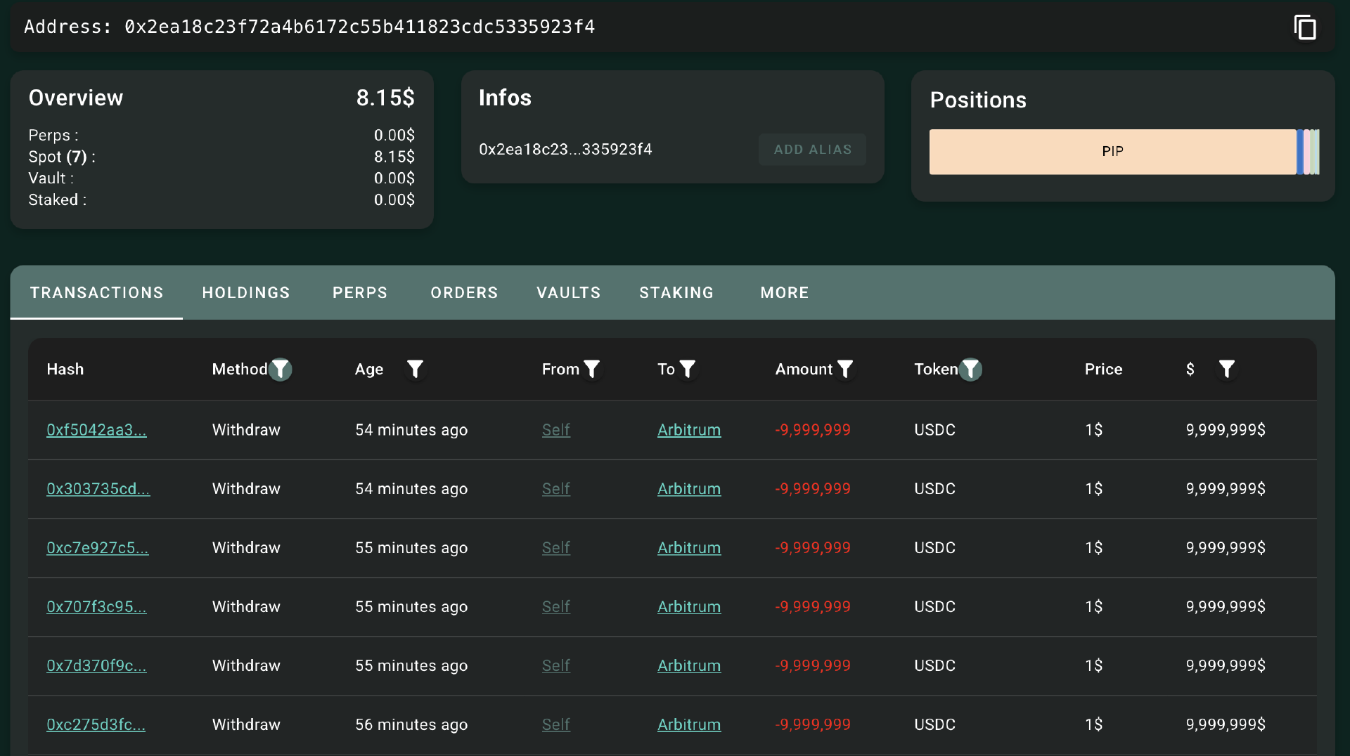 Приведём простой пример: данные Hypurrsan показывают, что адрес кита, начинающийся с 0x2ea18, за последние 24 часа получил прибыль в размере 72,33 млн долларов США, продавая BTC и ETH. Кит вывел 60 млн долларов США в USDC на Arbitrum и зафиксировал прибыль.