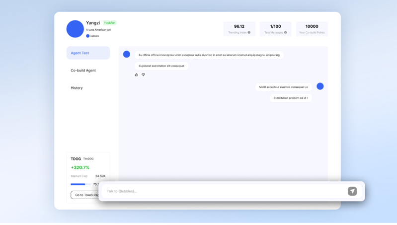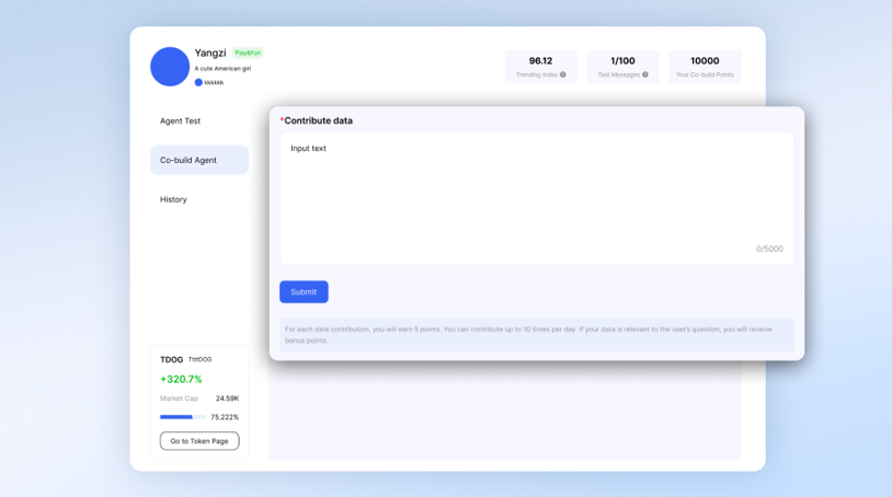 Каждая тестовая страница Агента позволяет пользователям общаться с Агентом, вносить данные и зарабатывать кредиты за совместную разработку, а также помогать совершенствовать ИИ посредством тестирования в сообществе.