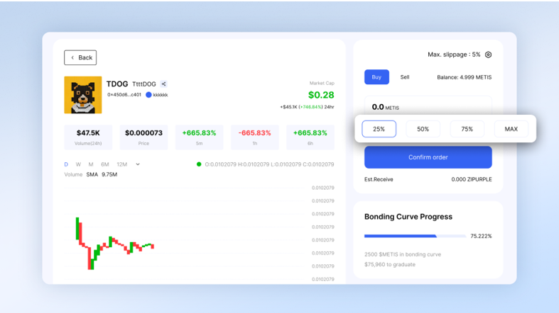 ● Быстрое заполнение: выберите 25% / 50% / 75% / Максимум для автоматического заполнения на основе баланса вашего кошелька.