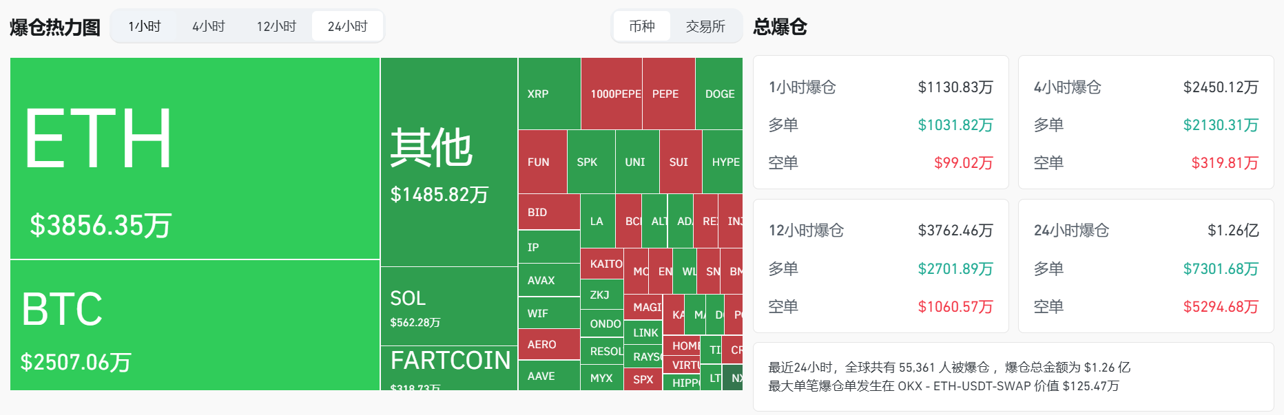 Ликвидация Ethereum (ETH) составила $38,5635 млн, а ликвидация Bitcoin (BTC) составила $25,0706 млн. За последние 24 часа было ликвидировано в общей сложности 55 361 человек, а самая крупная единичная ликвидация произошла в торговой паре ETH-USDT-SWAP на OKX со стоимостью $1,2547 млн.