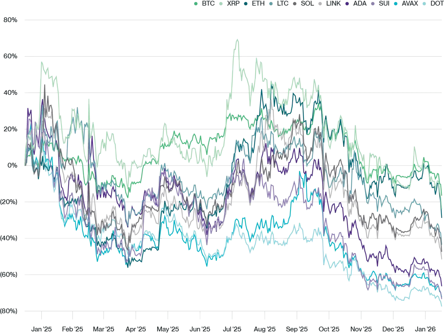 - Второй класс активов (SOL, LTC, LINK) пережил стандартный медвежий рынок, упав на 36,9% до 46,2%.