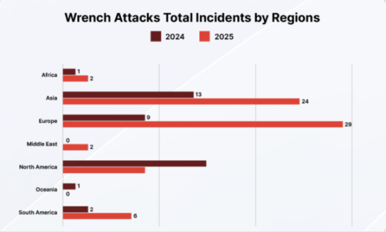 В географическом плане Европа впервые стала регионом с самым высоким уровнем риска в мире. В 2025 году на Европу будет приходиться более 40% всех известных инцидентов в мире, при этом Франция зафиксирует наибольшее количество нападений в мире, обогнав Соединенные Штаты. В отчете CertiK отмечается, что это изменение не означает исчезновения риска в Северной Америке, а скорее отражает распространение подобных преступлений в регионы со сложной правовой средой и более высокими затратами на трансграничное сотрудничество.