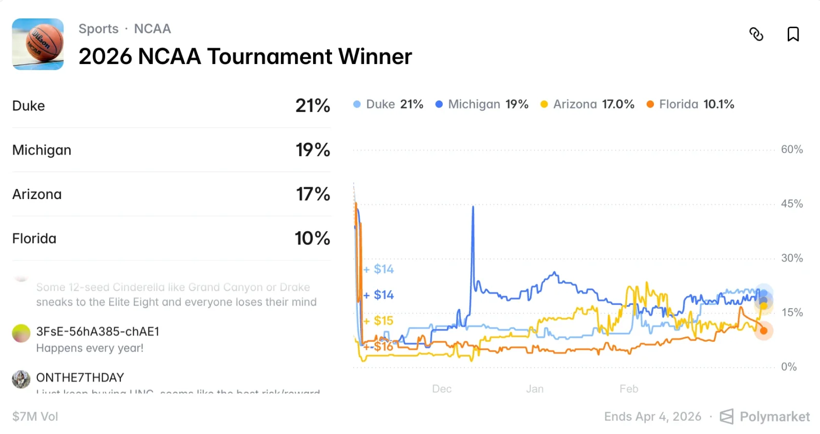 В настоящее время такие рынки прогнозов, как Polymarket и Kalshi, запустили события, связанные с турнирами "March Madness". Polymarket даже включил их в первую партию пилотных платных спортивных событий, по всей видимости, готовясь заработать целое состояние на предстоящем буме событий.