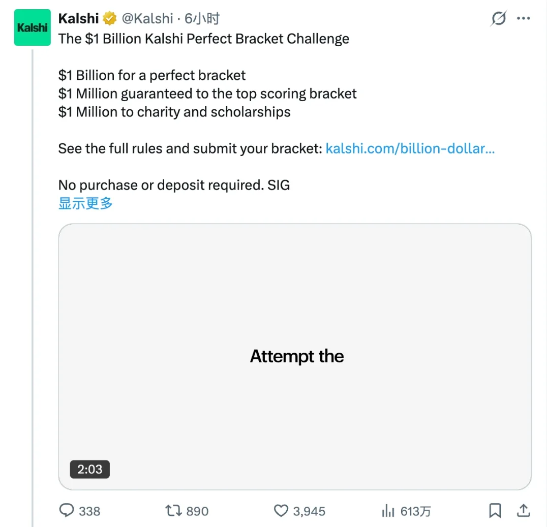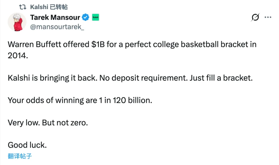 Ранним утром 17 марта рынок прогнозов Kalshi объявил на платформе X, что последует примеру Уоррена Баффета и запустит «Испытание идеального прогноза» для предстоящих игр NCAA «Мартовское безумие» — пользователи, которые идеально предскажут результаты всех игр, смогут выиграть главный приз в размере 1 миллиарда долларов.