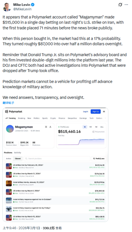 Согласно сообщению Майка Левина в социальной сети X, один из шести аккаунтов, аккаунт Polymarket под ником "Magamyman", заработал 515 000 долларов за один день. Первая транзакция была совершена за 71 минуту до того, как соответствующая новость была обнародована.