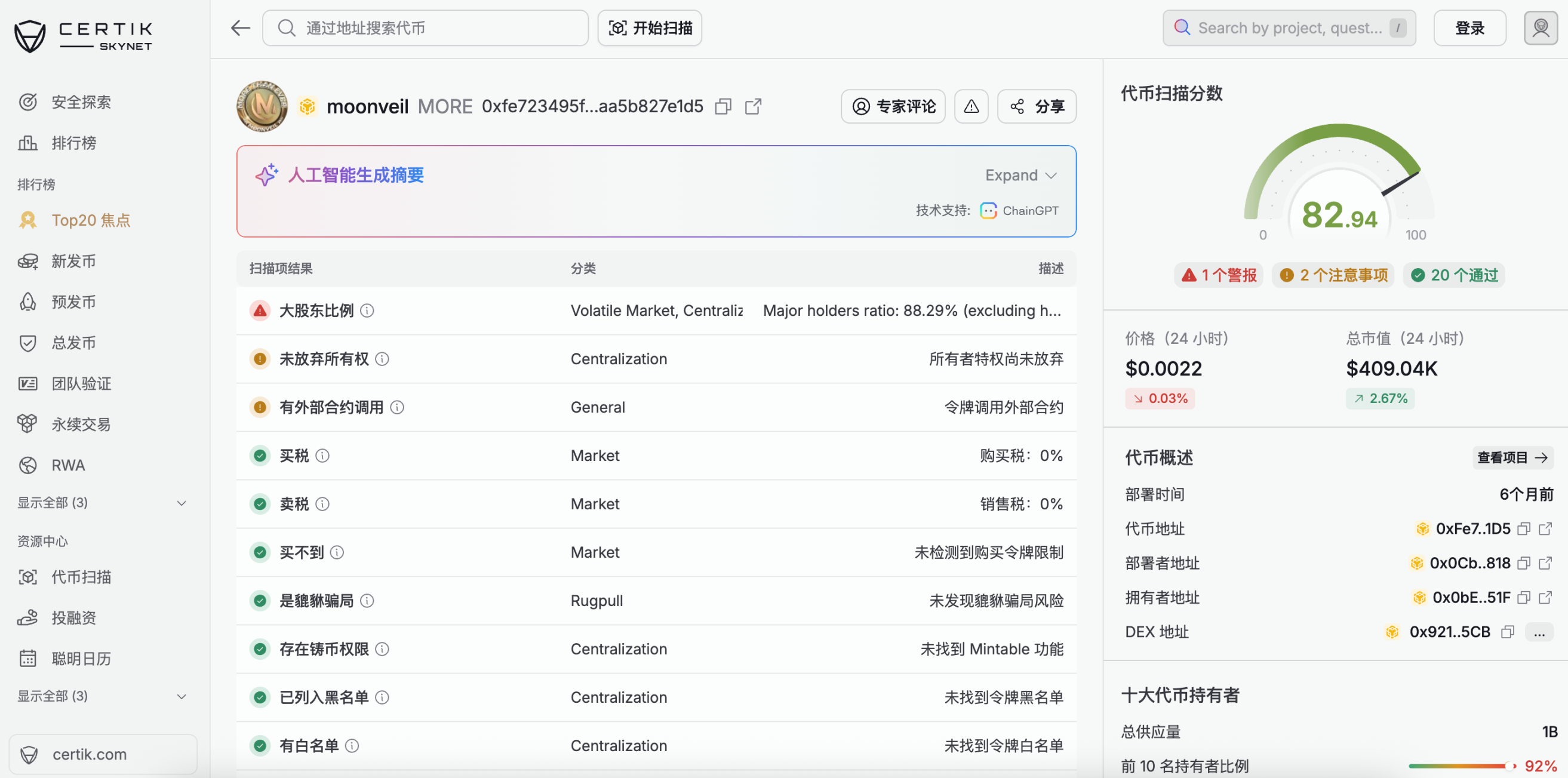 Сервис Skynet от CertiK может помочь в борьбе с такими атаками, как мошеннические схемы с выводом средств, оценивая общую безопасность проектов Web3 по шести параметрам: безопасность кода, структура проекта, операционная устойчивость, управление, динамика рынка и репутация сообщества. Проверка с помощью Skynet перед инвестированием позволяет эффективно отфильтровать многие риски. Кроме того, пользователи могут использовать инструменты сканирования токенов для получения базовой информации, такой как процент держателей токенов, наличие у них полномочий на изменение параметров токенов, наличие налогов на транзакции и является ли это финансовой пирамидой. Помимо этого, отчеты серии Skynet от CertiK и список Skynet Top 20 предоставляют авторитетные справочные материалы по оценке безопасности на основе анализа данных и прозрачных количественных стандартов оценки, помогая выявлять прогнозируемые риски.