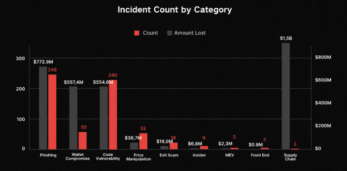 За исключением Bybit, фишинговые атаки были наиболее распространенным и дорогостоящим методом атак в 2025 году: 248 инцидентов привели к убыткам в размере приблизительно 773 миллионов долларов. Кража средств из кошельков заняла второе место по финансовым потерям: 55 инцидентов привели к убыткам в размере приблизительно 557 миллионов долларов. С моей точки зрения, многие мои друзья столкнулись с кражей средств и необъяснимым переводом всех своих активов из кошельков в 2025 году из-за случайного перехода по ссылкам. Следовательно, фактические потери, вызванные этими двумя методами атак, вероятно, превышают статистику отчета, и подобные атаки могут стать все более распространенными в будущем.