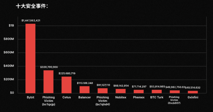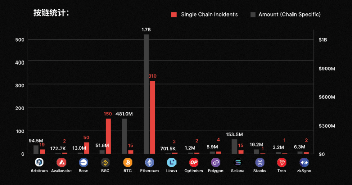 Наибольший объем украденных средств был зафиксирован в сети Ethereum из-за инцидента с Bybit; однако, если исключить украденные 1,4 миллиарда долларов, Bitcoin стал блокчейном с наибольшим объемом украденных средств. В Bitcoin, который не поддерживает смарт-контракты, кошельки были опустошены в основном из-за утечек закрытых ключей, фишинговых атак и других причин.