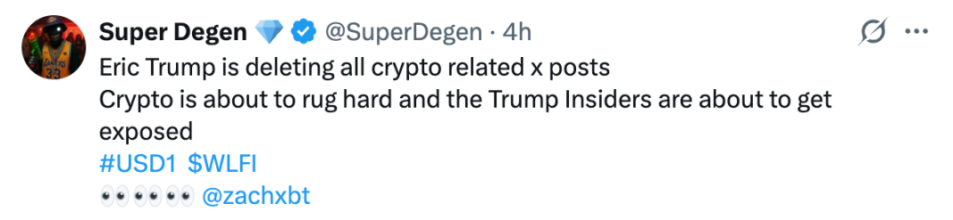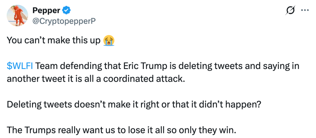 После этой «кровопролития, вызванного удалением твитов», некоторые сторонники WLFI или случайные наблюдатели заявили, что действительно видели множество сообщений на X, утверждающих, что «Эрик Трамп» удалил все твиты, связанные с криптовалютами. Однако аккаунт Эрика лишь удалил из Твиттера официальное объявление WLFI о том, что «на Binance будет добавлено больше торговых пар с USD1», и не удалял твиты массово.