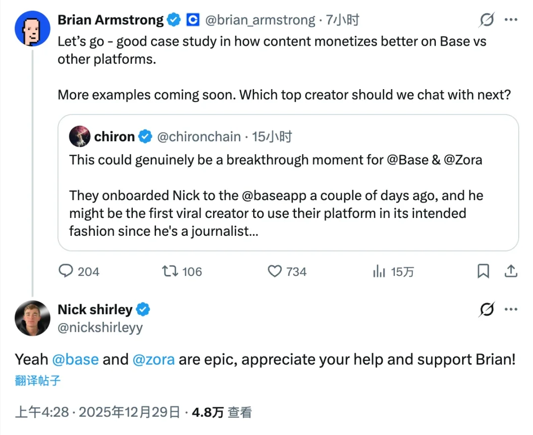 Брайан Армстронг заявил, что это доказывает, что монетизация контента на Base более эффективна, чем на других платформах, а Ник Ширли также поблагодарил Брайана Армстронга после получения прибыли, назвав Base и Zora «легендарными».