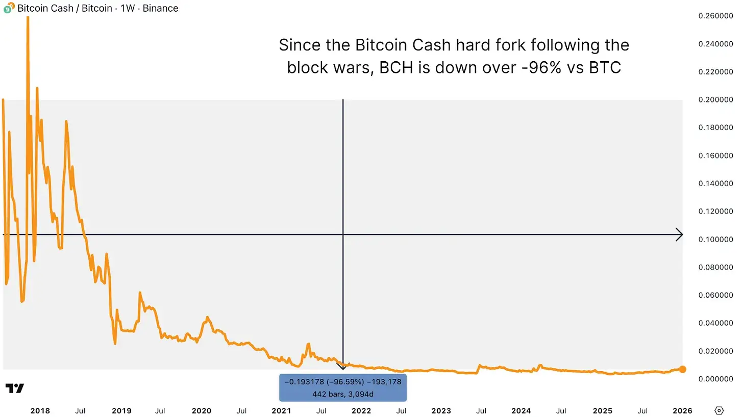 Рисунок 3: Bitcoin Cash (BCH) устранил некоторые опасения относительно размера блока и скорости, но не смог завоевать значительную долю рынка.