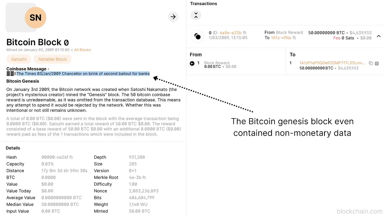 В официальном документе Bitcoin говорится, что это «одноранговая электронная платежная система». Ее цель ясна: Bitcoin стремится облегчить поток денежной информации и передачу ценностей. Однако Bitcoin никогда не ограничивался только денежной информацией. Его протокол недискриминационен; он просто записывает информацию.