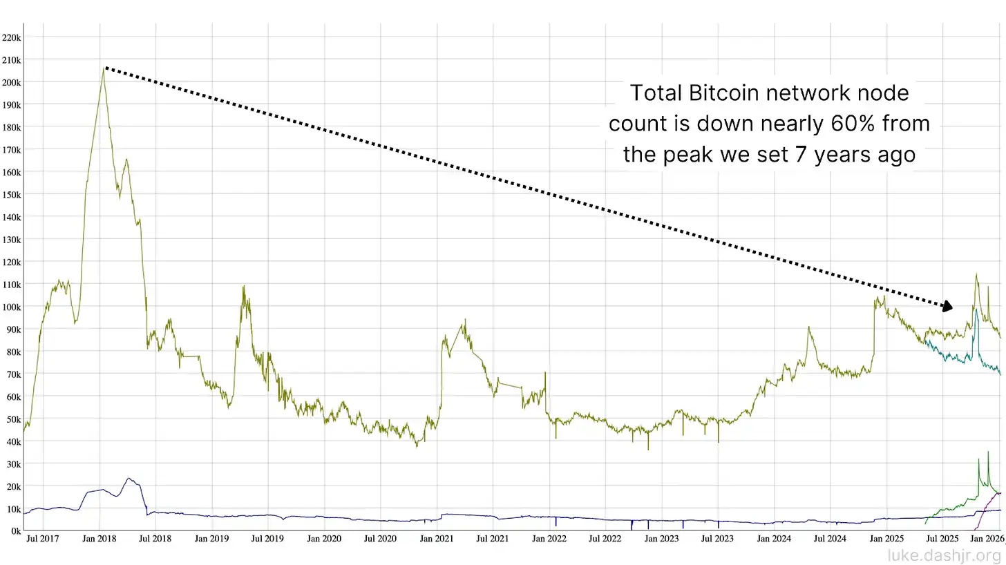 Это долгосрочная угроза. Децентрализация Биткоина зависит от того, готовы ли обычные люди бесплатно проверять сеть. Однако человеческая природа склонна к централизации посредством специализации и аутсорсинга доверенным третьим сторонам, что особенно заметно в услугах по хранению Биткоина. Если большинство участников экосистемы перейдут на хранение, это создаст значительные центральные и системные риски для Биткоина.