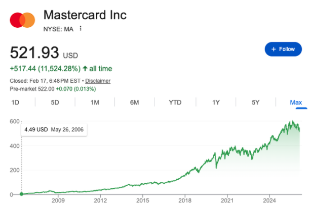 Если вернуться в 2006 год, то Mastercard провела IPO 24 мая 2006 года по цене 39 долларов за акцию. В то время она рассматривалась скорее как традиционная финансовая инфраструктура, представляющая собой «сеть банковских карт/клиринг и обработку платежей».