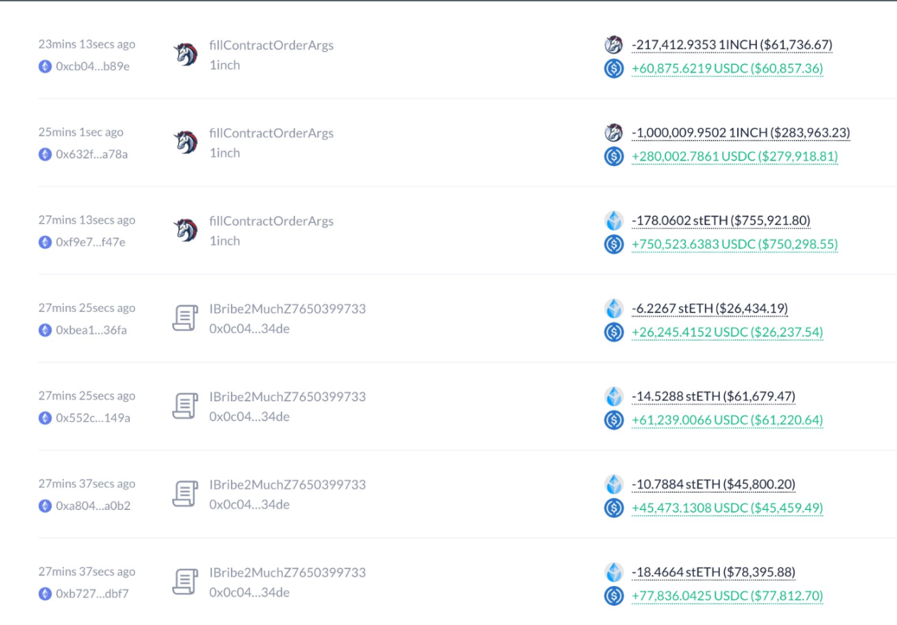 По данным аналитика блокчейна Ю Цзина, 11 августа инвестиционный фонд команды 1inch начал продавать часть своих первоначальных позиций в блокчейне. Данные показывают, что было продано 5000 ETH по средней цене 4215 долларов США, получив 21,07 миллиона USDC; одновременно было продано 6,45 миллиона 1INCH по средней цене 0,28 доллара США, получив примерно 1,8 миллиона USDC.