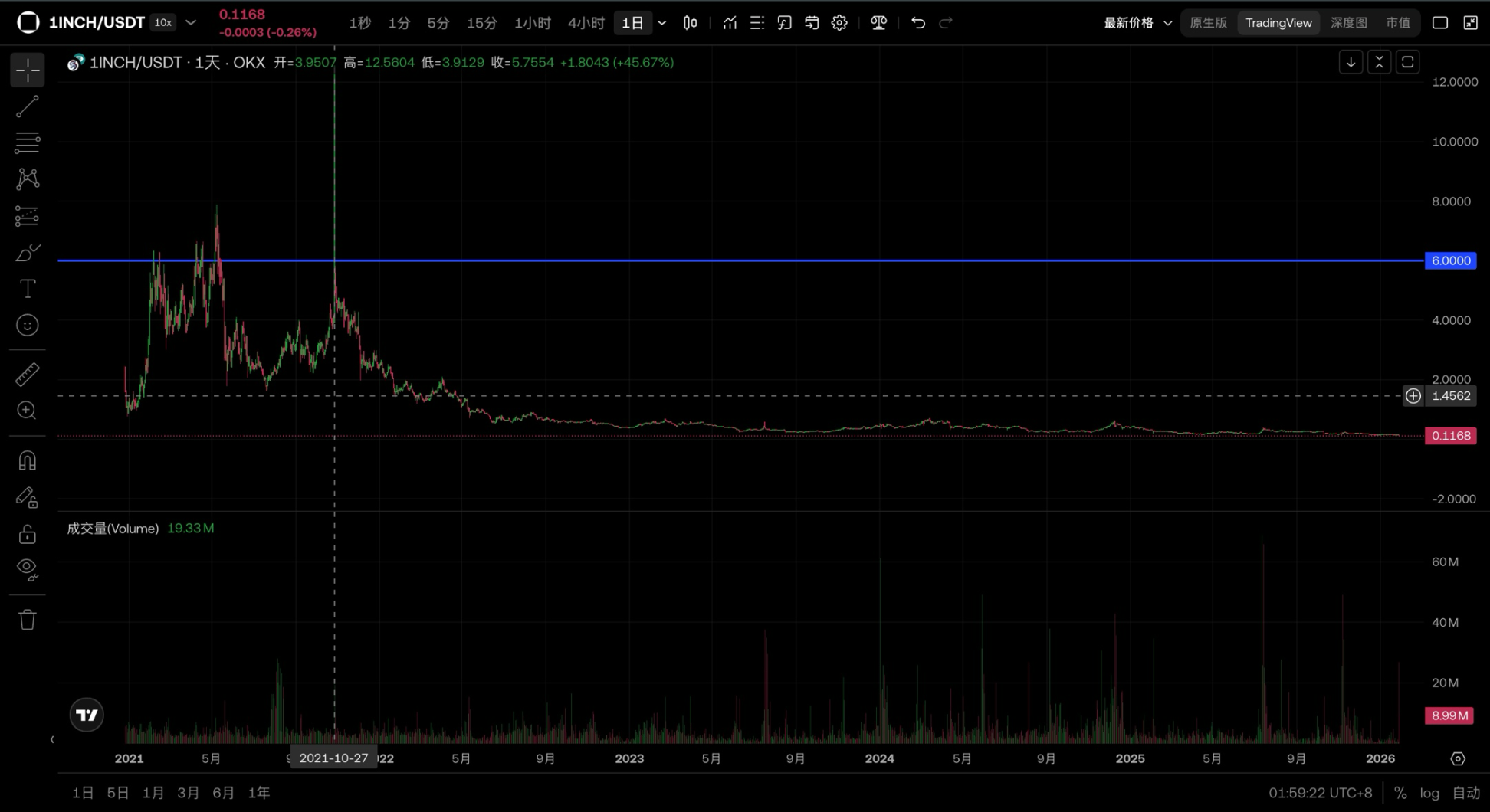Однако, даже если в конечном итоге окажется, что это неверное толкование, эта распродажа все равно представляет собой реальный вторичный шок для и без того ослабевающей цены 1INCH. С момента достижения предыдущего циклического максимума в 6 долларов 1INCH пережил длительный период одностороннего снижения и сейчас колеблется около 0,11 доллара.