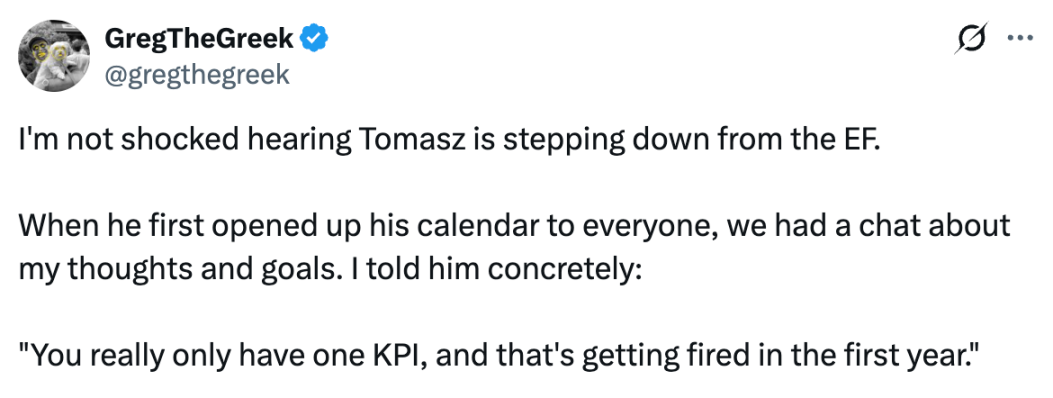 Один из ключевых участников консенсусного уровня Ethereum, пользователь под ником GregTheGreek, написал , что год назад, когда он разговаривал с Томашем, тот сказал: «У тебя всего один KPI, и это — быть уволенным в первый же год». GregTheGreek сделал это заявление по двум причинам: во-первых, борьба за власть внутри Ethereum остается острой, и председатель фонда Ethereum Ая по-прежнему обладает значительным влиянием. Изменения, инициированные Томашем, не устранили этот «источник», что привело к исключению первоначальных групп интересов.