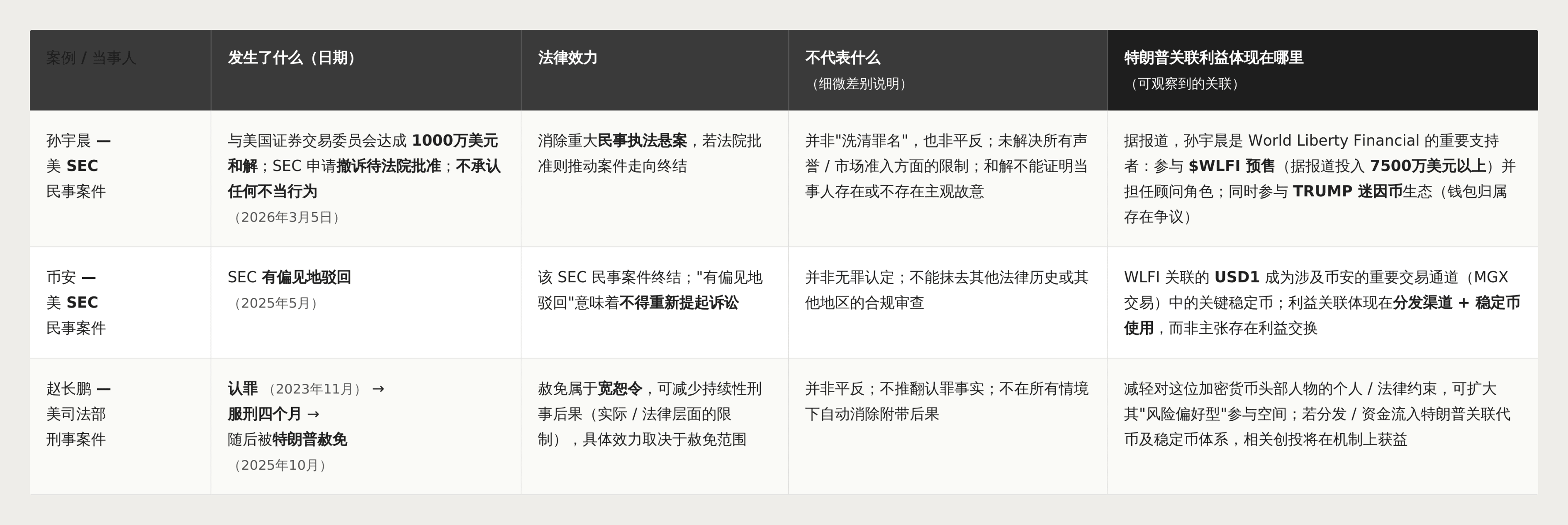 Мировое соглашение с Джастином Саном положило конец гражданскому делу о мошенничестве, но не стало оправдательным приговором. Гражданский иск Binance против SEC был отклонен без права повторного рассмотрения. Помилование CZ было судебным помилованием, а не отменой его признания вины.