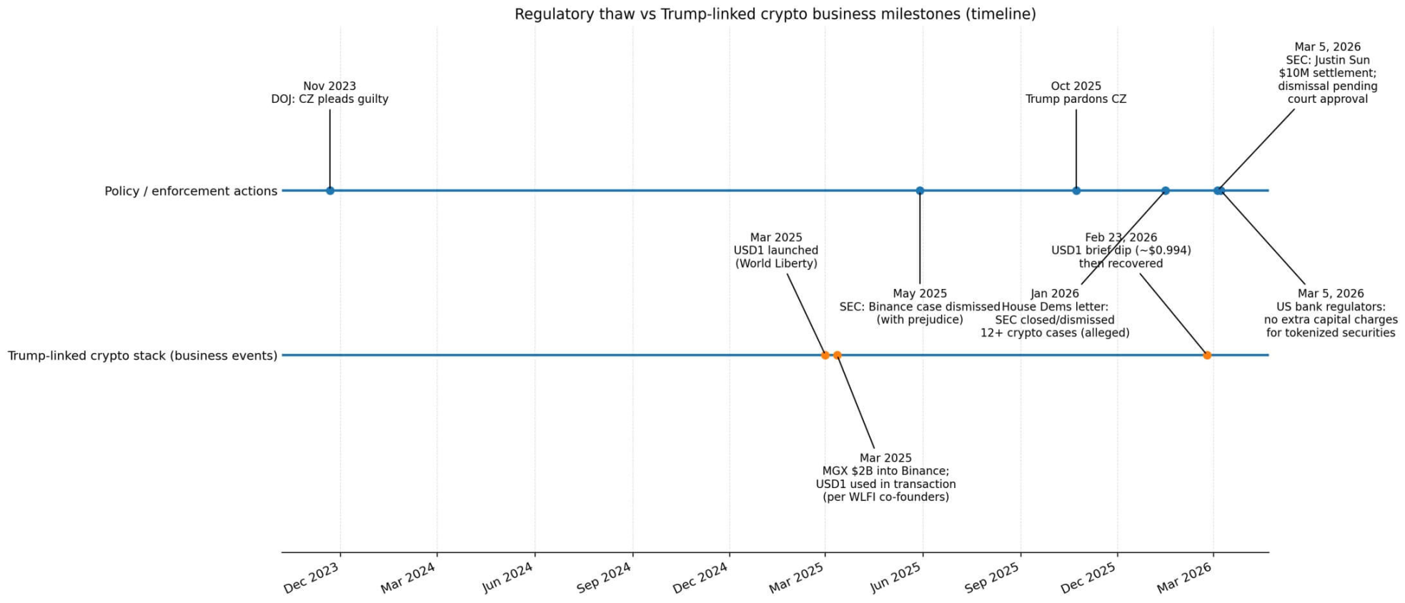 В мае 2025 года гражданский иск Комиссии по ценным бумагам и биржам (SEC) против Binance был отклонен и не может быть подан повторно. В октябре 2025 года Трамп помиловал основателя Binance Чанпенга Чжао (CZ), который в ноябре 2023 года признал себя виновным в отмывании денег и нелицензированных денежных переводах, выплатил миллиарды долларов штрафов и отсидел четыре месяца в тюрьме.